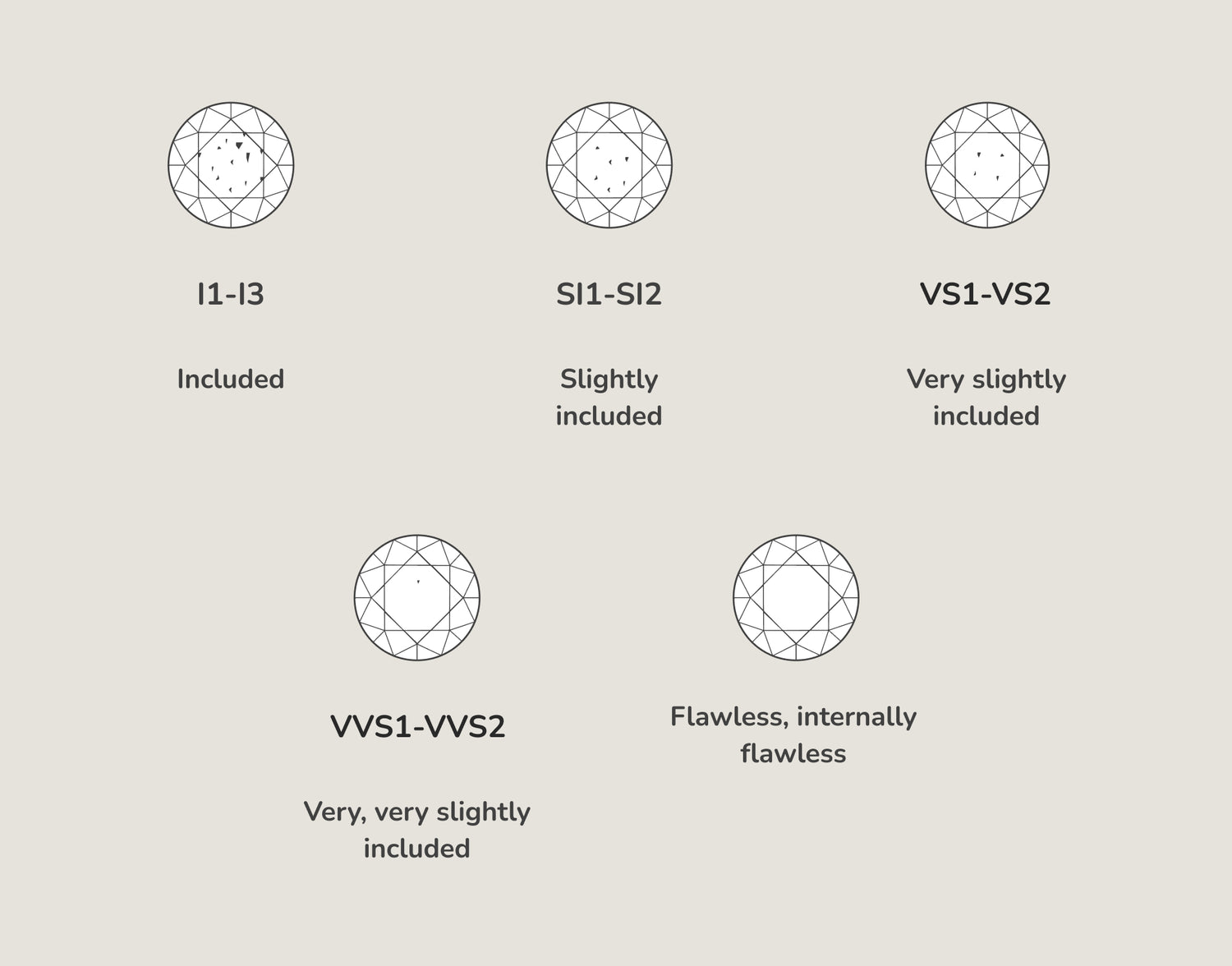 The diamond clarity chart defines the level of natural imperfections in diamonds, known as inclusions and blemishes. Ranging from flawless (no inclusions) to included (visible inclusions), this chart assists in evaluating how clarity affects a diamond's purity and brilliance.
