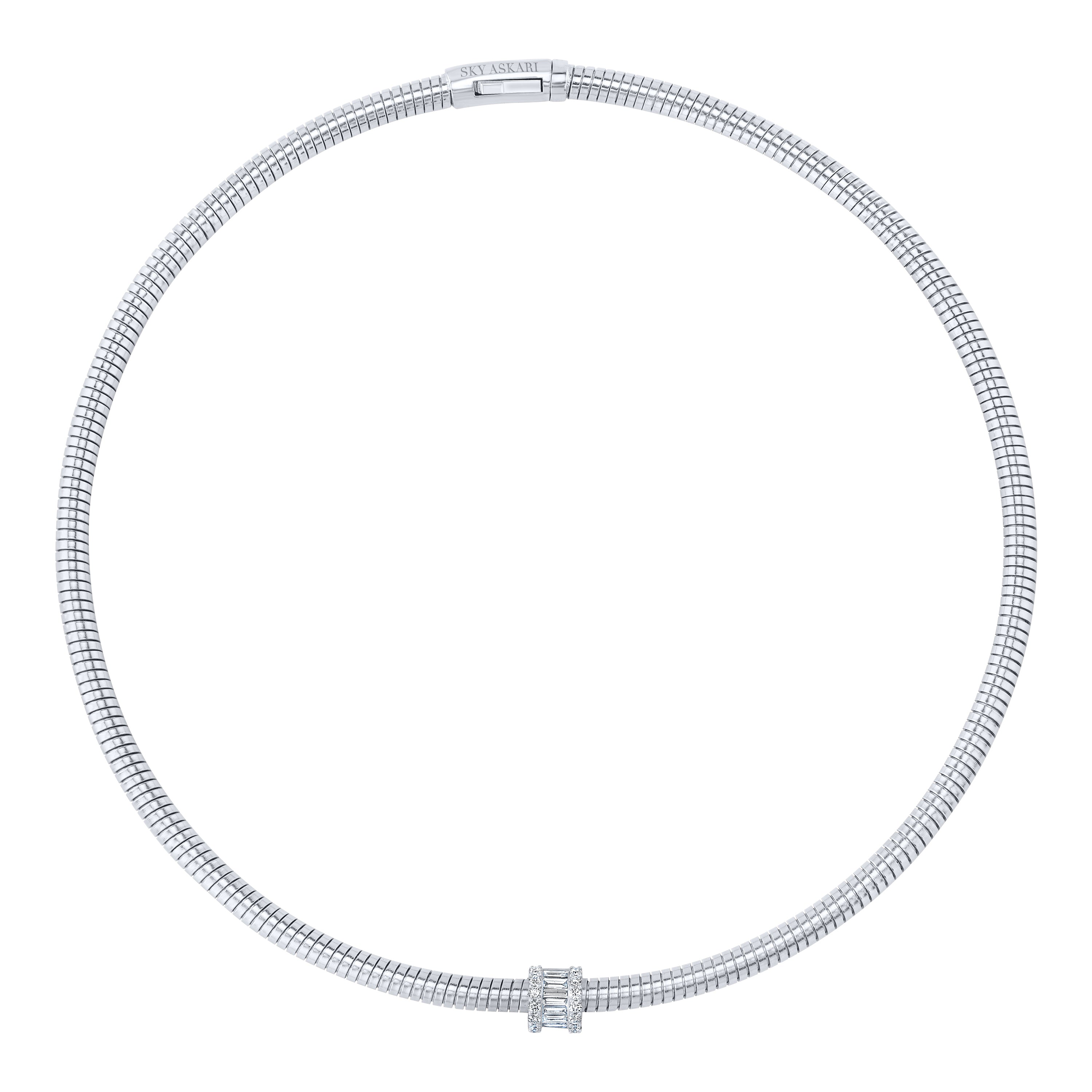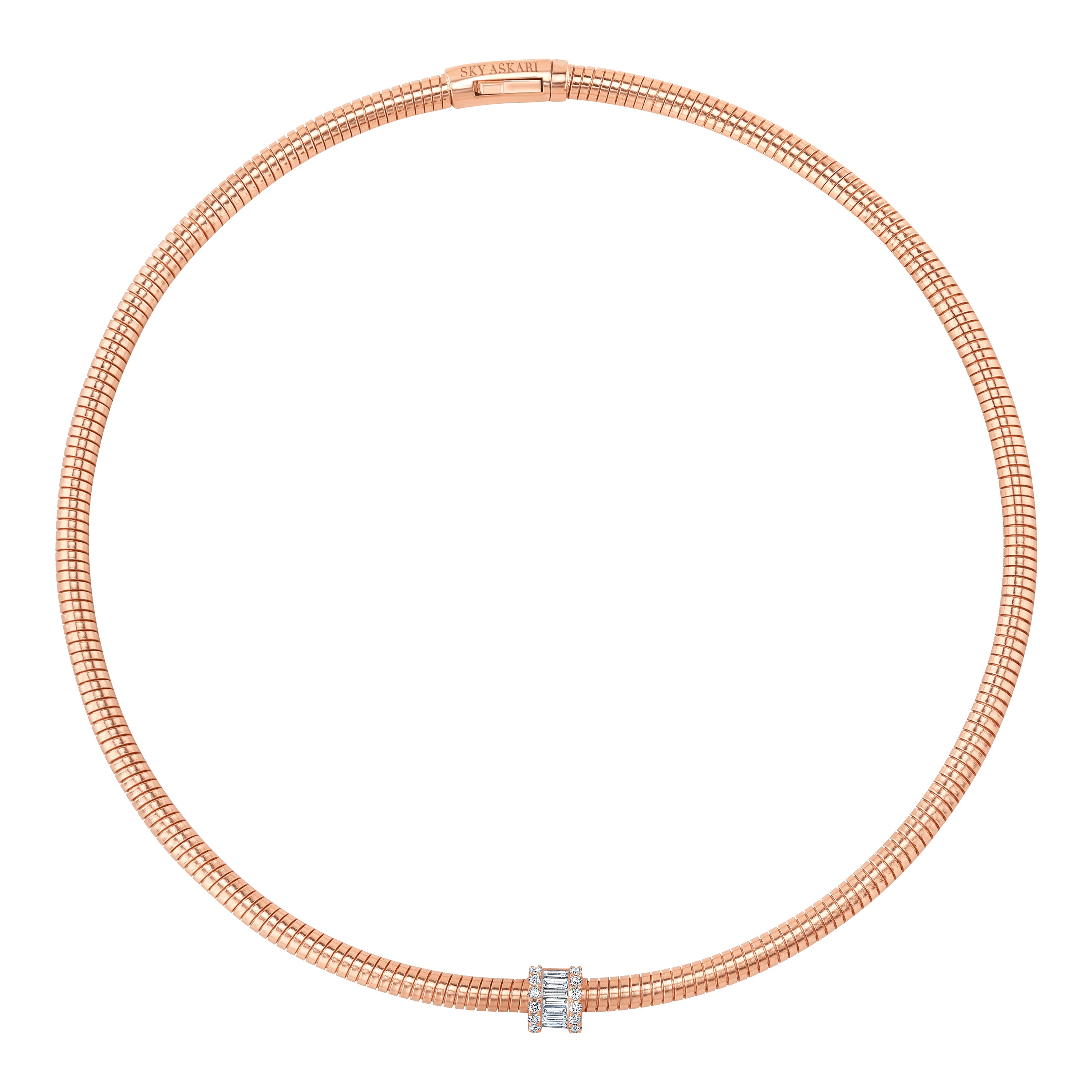 Crafted in 18K rose gold, our Resilience Sleek Collar Necklace is a striking blend of elegance and strength. It features a dazzling 1.15 ct VS+ combination of baguette-cut and round brilliant diamonds, thoughtfully arranged to catch the light from every angle. This necklace symbolizes resilience and inner strength, making it a statement piece that is both sophisticated and empowering, perfect for elevating any look with timeless elegance.