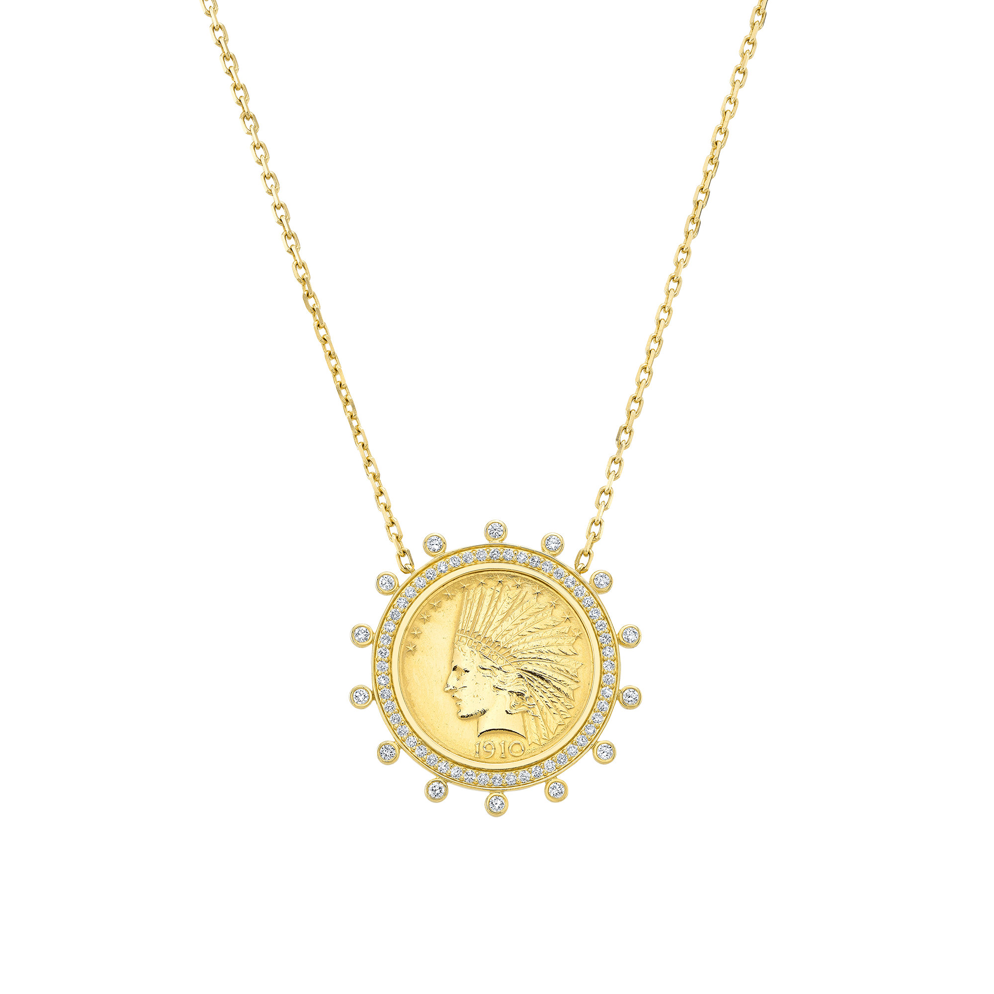 For a blend of cultural charm and opulence, adorn yourself in our 18k Yellow Gold Large Indian Coin Necklace. This piece from the Sky Askari Coin Collection features 1.80 total carat weight in round brilliant cut VS diamonds. The 22k Indian Coin hangs on a 20-inch chain.
