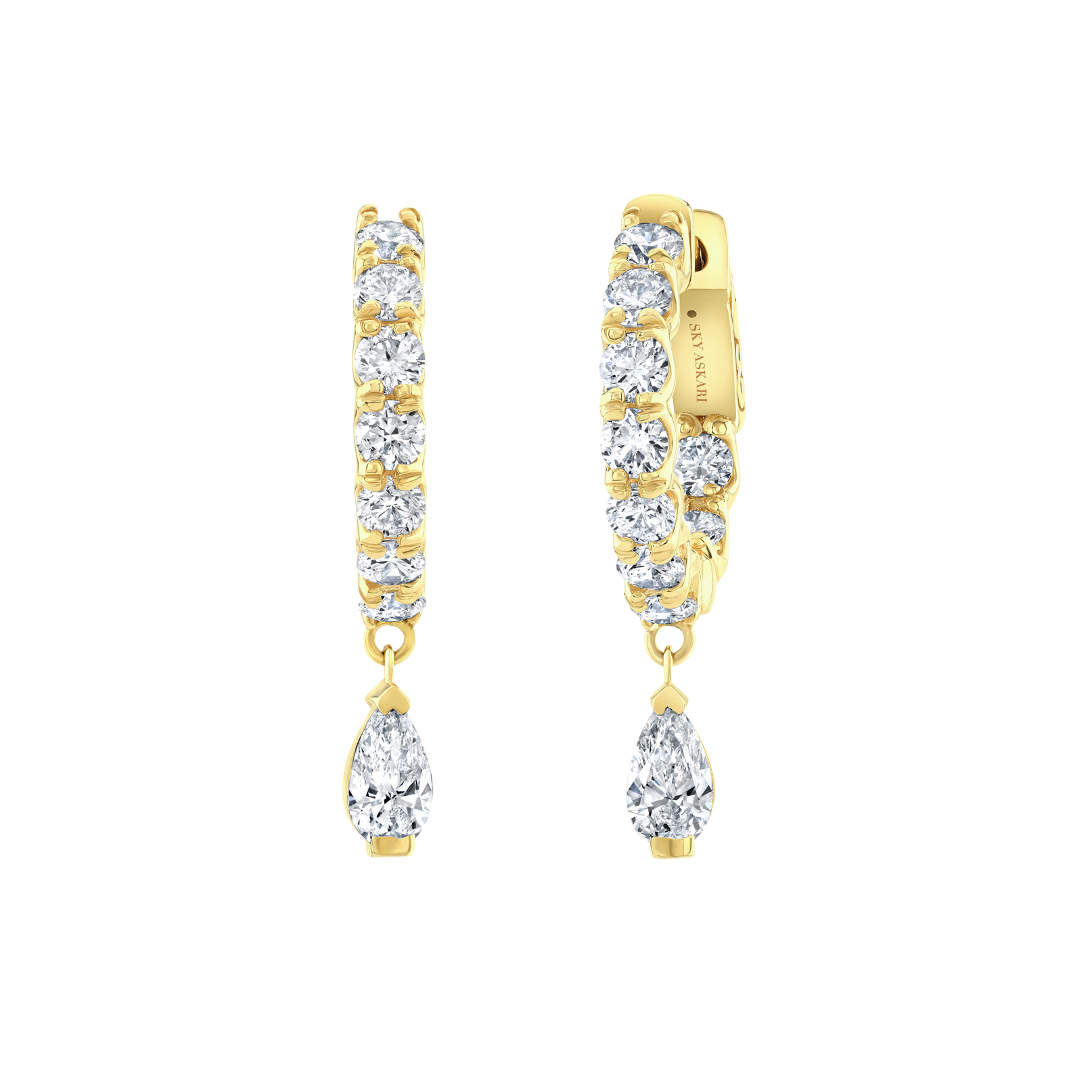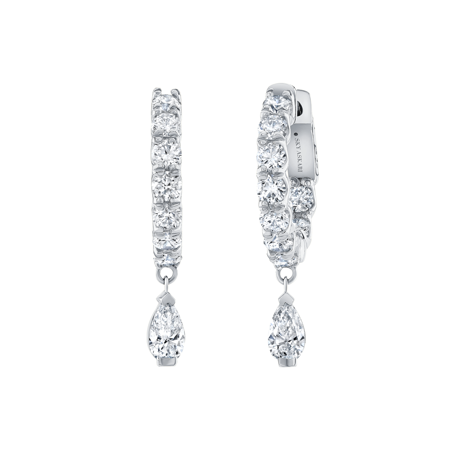 Experience the luxurious elegance of our Small Hoop Eternity with Dangling Pear Earrings. Crafted from high-quality 18K metal and featuring a stunning 2.10 carat total weight of round brilliant and pear-shaped diamonds, these earrings from the Sky Askari Waterfall Collection are a must for your anthology. The diamonds are set in a dazzling 18K bezel setting, adding to their beauty and sophistication.